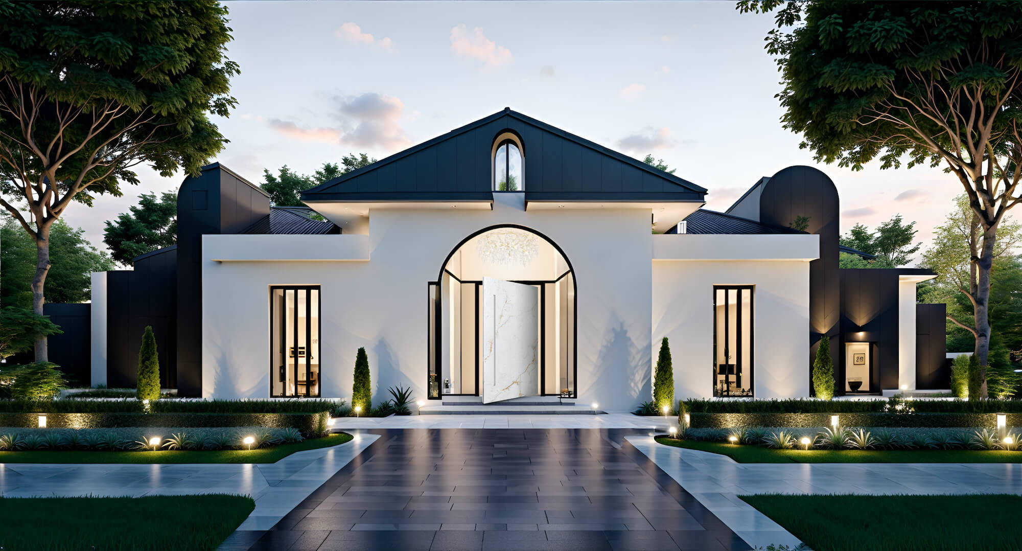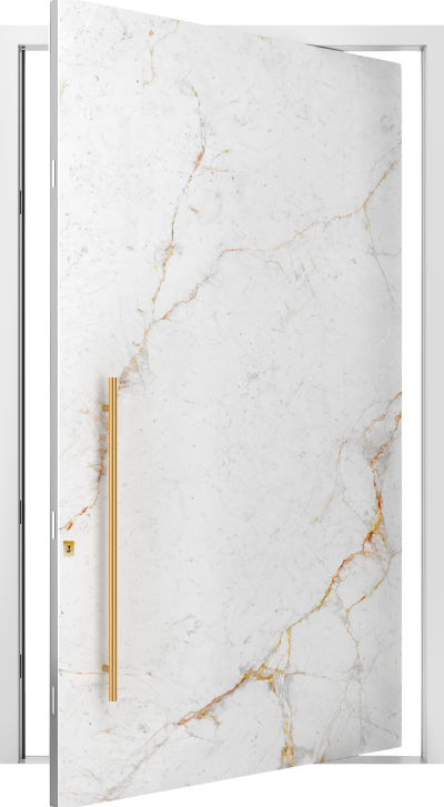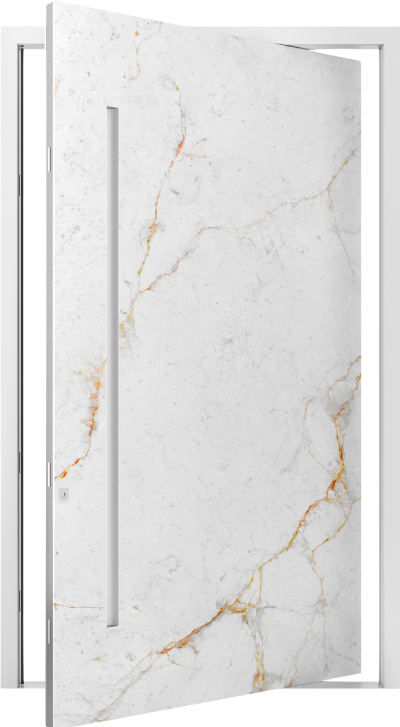 W naszej ekskluzywnej propozycji wypełnienia drzwiowego użyliśmy unikalnego spieku kwarcowego. Złote wzory wkomponowane w powierzchnię wypełnienia efektownie błyszczą na delikatnym białym tle o satynowym wykończeniu. Model ten został zaprojektowany w dwóch wersjach, aby inspirować architektów do tworzenia indywidualnych kreacji na drzwiach zewnętrznych.