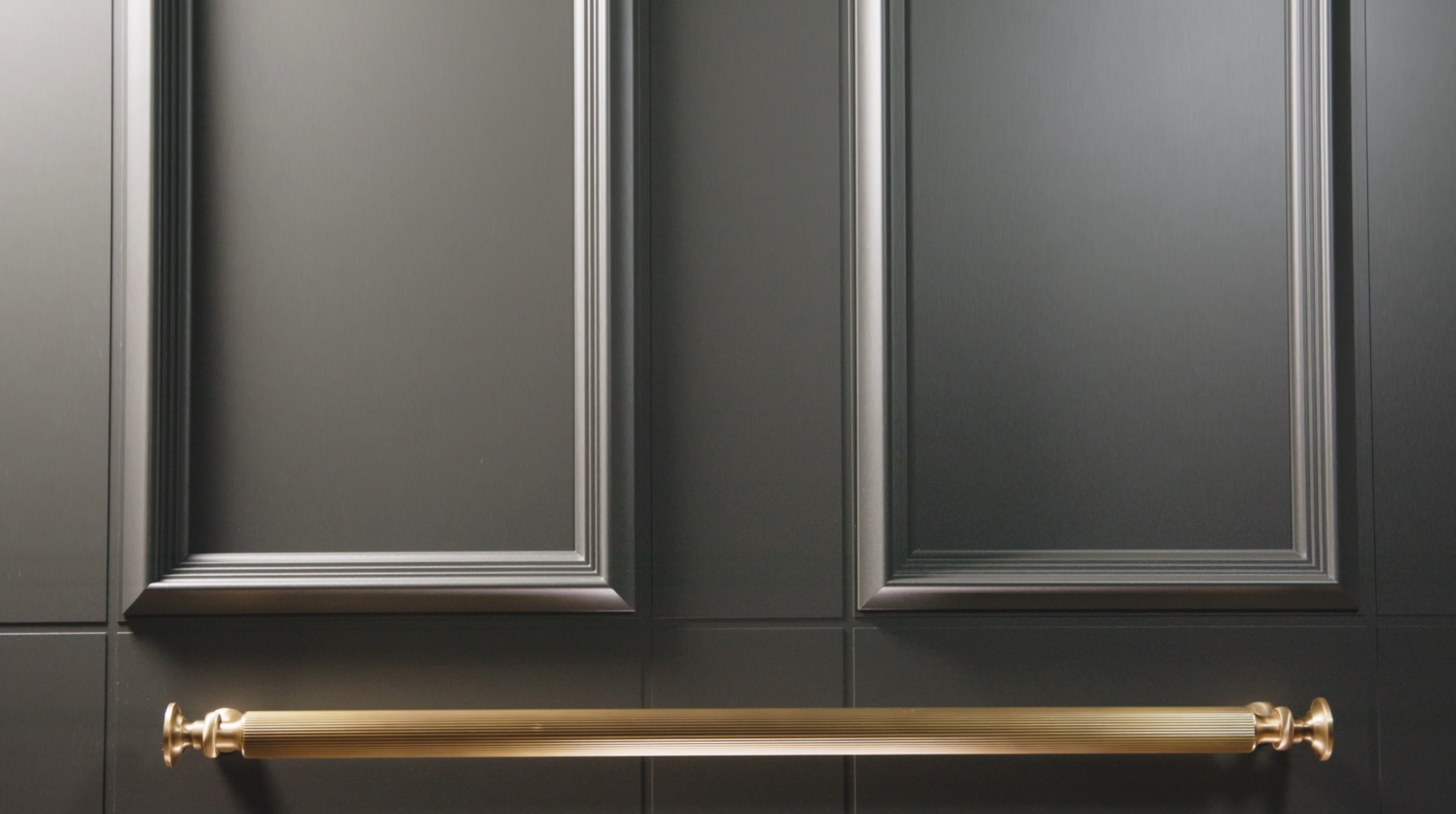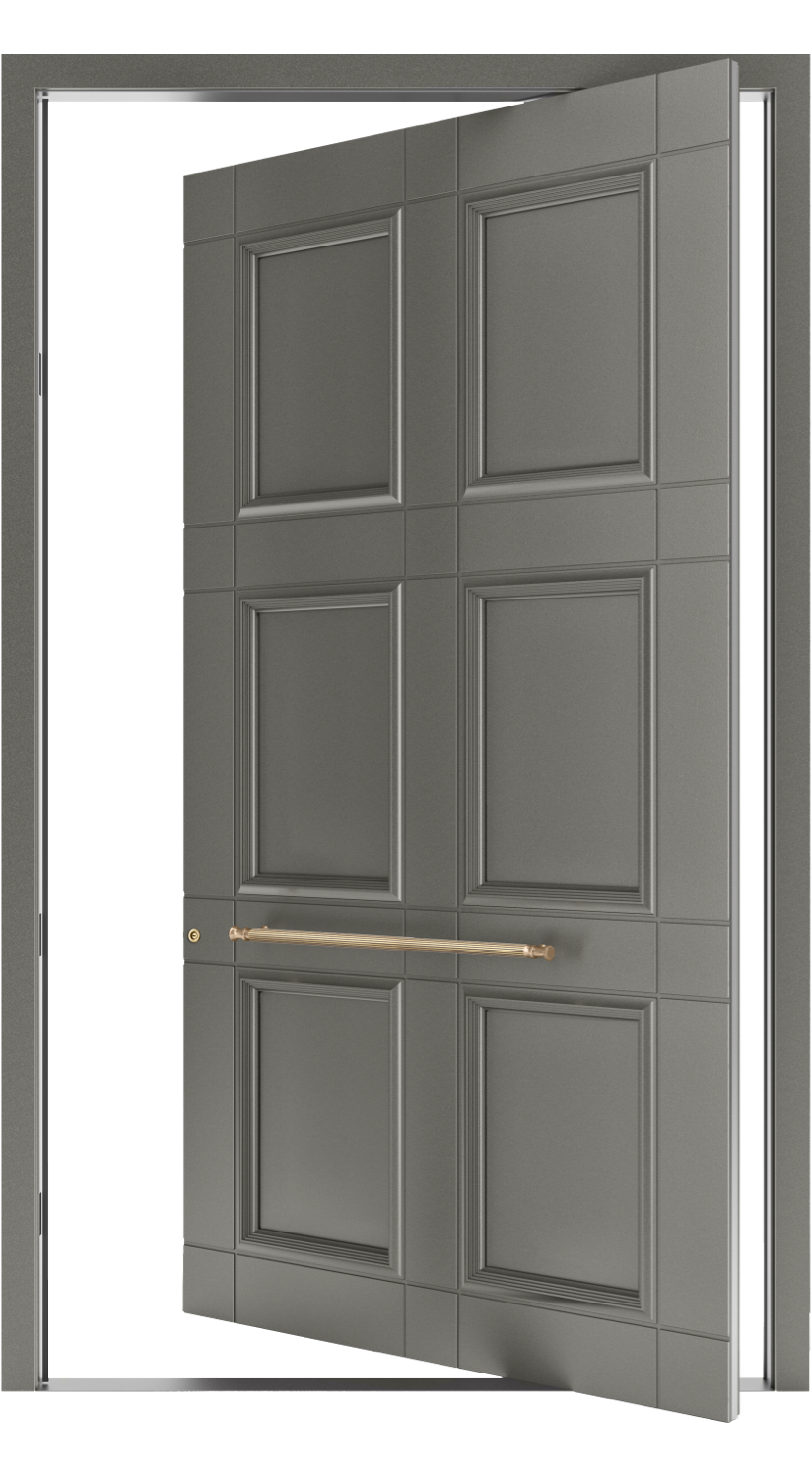 Ten model zaprezentowano w uniwersalnym, szarym kolorze, który doskonale komponuje się z wyrazistym złotym akcentem w postaci poziomego ozdobnego uchwytu. Jest to rozwiązanie, które sprawdzi się zarówno w nowoczesnych, jak i klasycznych budynkach.