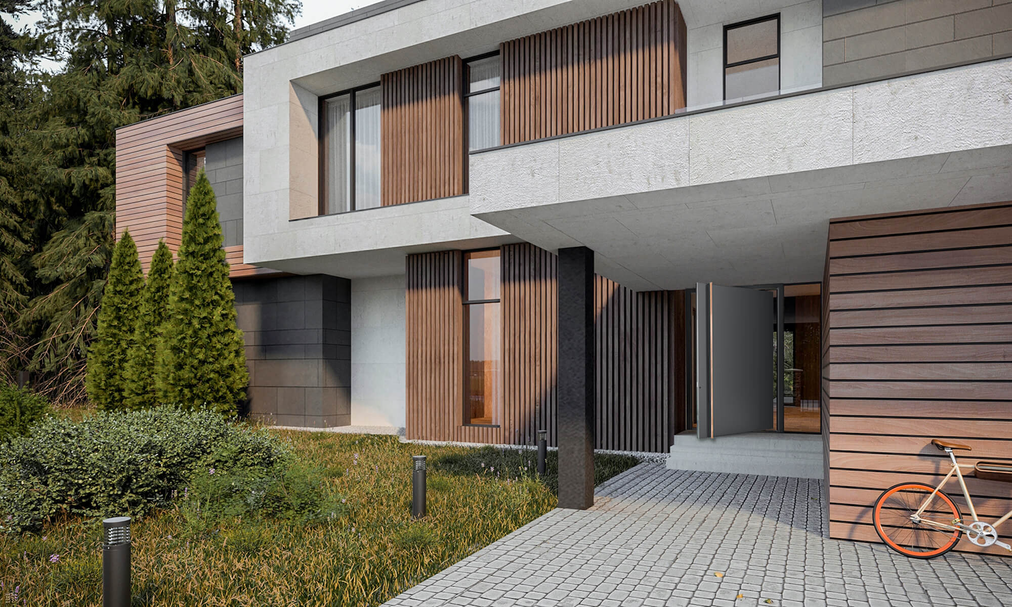 Pochwyt PZD zamontowano na całej wysokości skrzydła, dzięki czemu uzyskano nie tylko wyjątkowy wygląd drzwi, lecz także zapewniono wygodę ich użytkowania. Charakterystyczna wstawka z naturalnej dębiny w pochwycie sprawia, że ten model drzwi bardzo dobrze wkomponuje się w projekty, w których zastosowano drewnopodobne materiały elewacyjne.