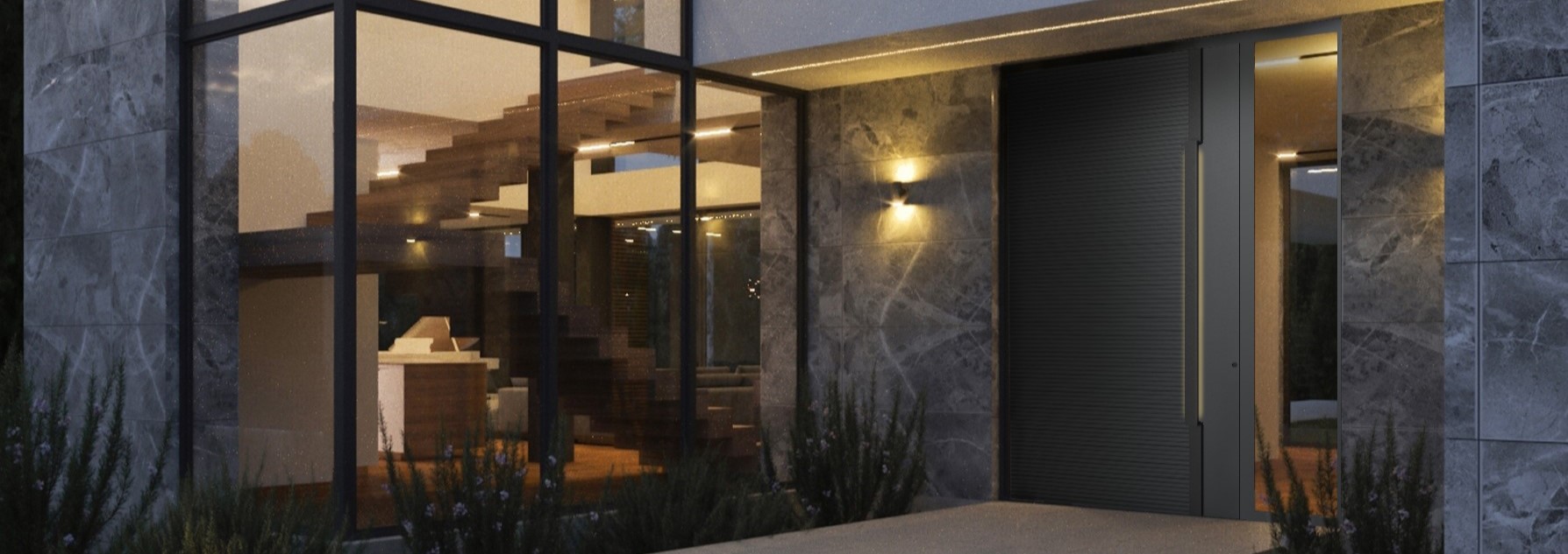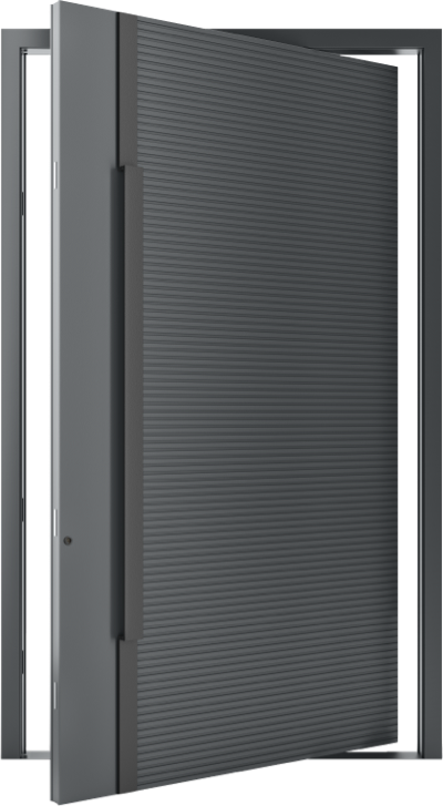 Model PIVOT 04 dzięki swojemu designowi sprawdzi się świetnie w nowoczesnych realizacjach. Frezowania na powierzchni wypełnienia drzwiowego są możliwe dzięki technologii tworzenia poziomych regularnych przetłoczeń na panelu aluminiowym. Wzór został przełamany czarnym pionowym pochwytem PZL. Technologia wykonania pochwytu pozwala na dopasowanie go do wysokości drzwi i zamontowanie w kształcie klamry oraz zastosowanie elektroniki.